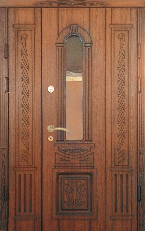 Поскольку в большинстве случаев устанавливаемые на входе в коттедж двустворчатые двери являются еще и предметом интерьера, украшающим здание, их дизайну предается особое значение. Эти двери, как правило, отделываются атмосферостойким МДФ, натуральным шпоном, массивом. Эффектно на таких дверях смотрится витражный узор, применение ковки, зеркальных элементов. Вариантов декора входной двустворчатой двери масса, тут все зависит от пожеланий заказчика.